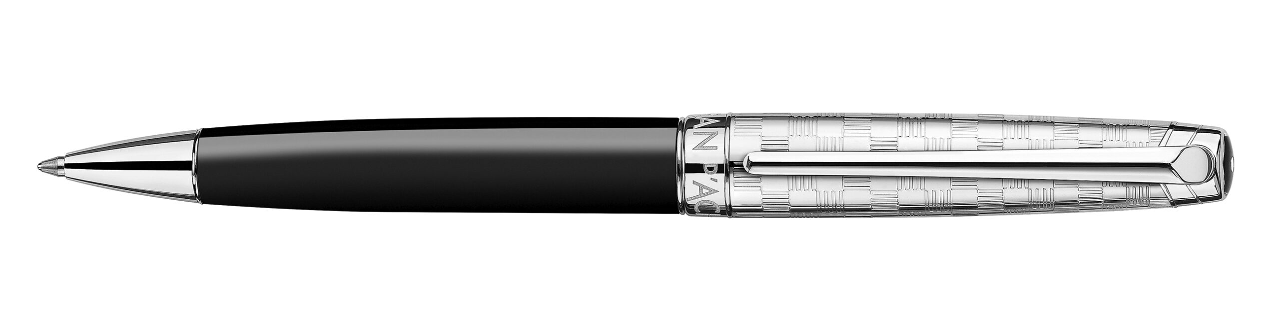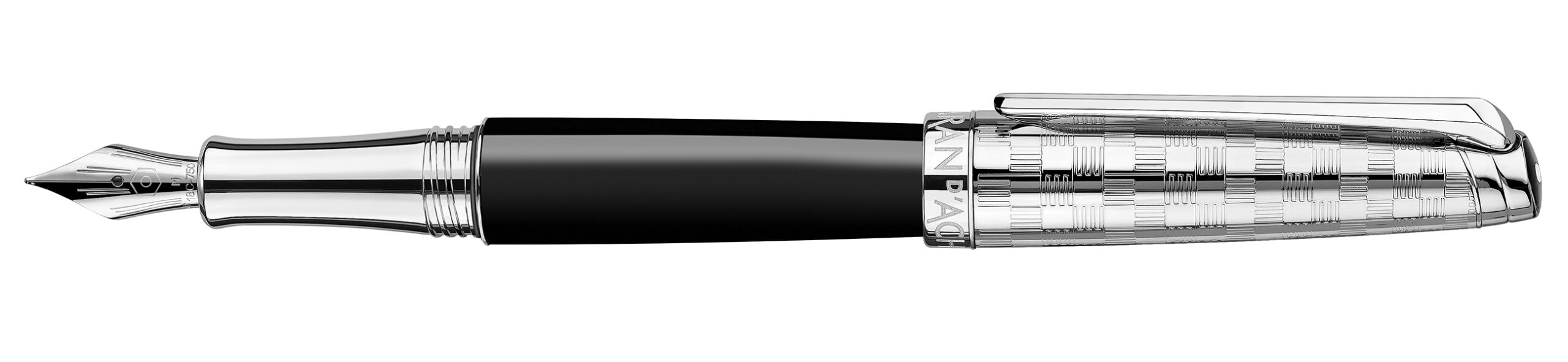Die Gravur ist präzise, fast überakribisch, und sie lebt vom Kontrast zum glatten, tiefschwarz lackierten Schaft, der Schlichtheit nicht als Reduktion, sondern als Souveränität versteht. Hier glänzt nichts um des Glanzes willen. Alles steht im Dienst der Geste.