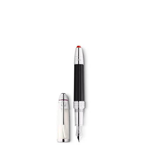 Der Kappenring schließlich ist eine Anspielung auf alte Gitarrenkabel der Sechzigerjahre – spiralförmig, leicht elastisch, fast retro-futuristisch. Und im Innern ruht die handgefertigte Goldfeder mit seinem Porträt, fein rhodiniert, eher Andeutung als Idol.