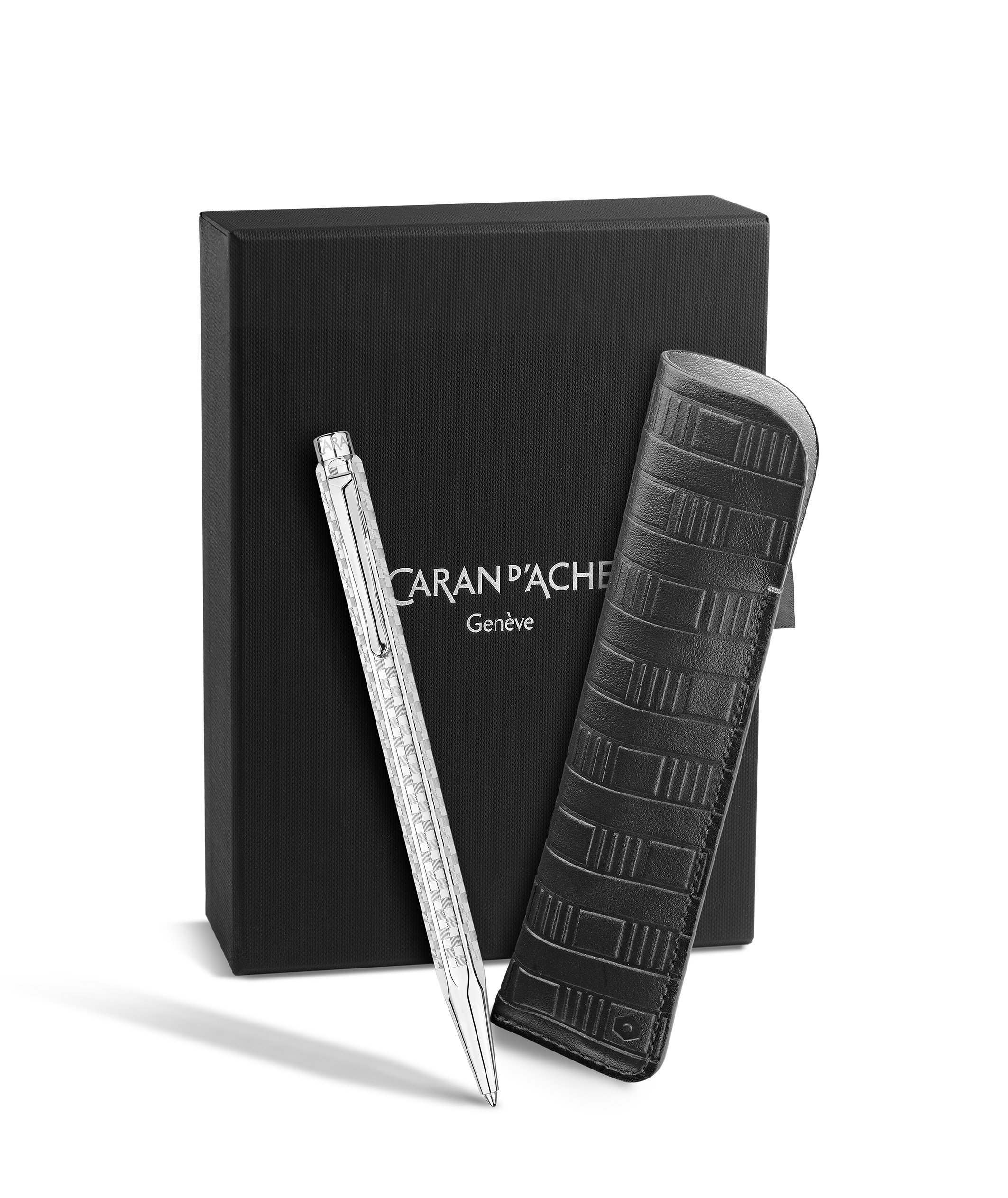 Set Kugelschreiber Ecridor™ Damier Silbergrau & Etui aus Leder Schwarz
