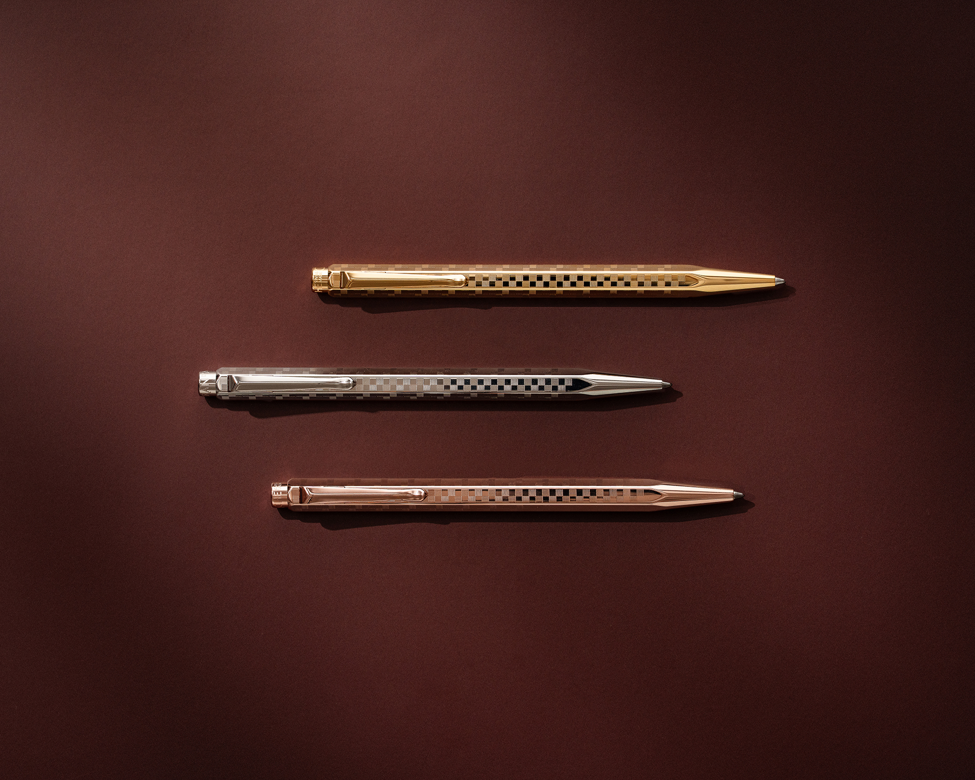Die Schreibinstrumente kombinieren einen schwarzen, lackierten Messingschaft – schlicht und modern – mit einer diamantgravierten Kappe im Damier-Muster, was das handwerkliche Können des Hauses widerspiegelt.