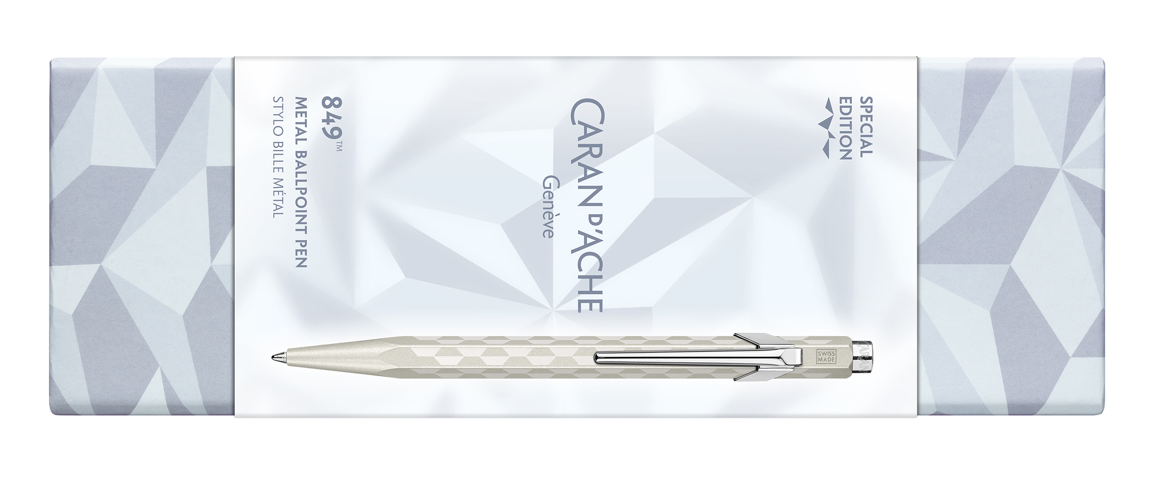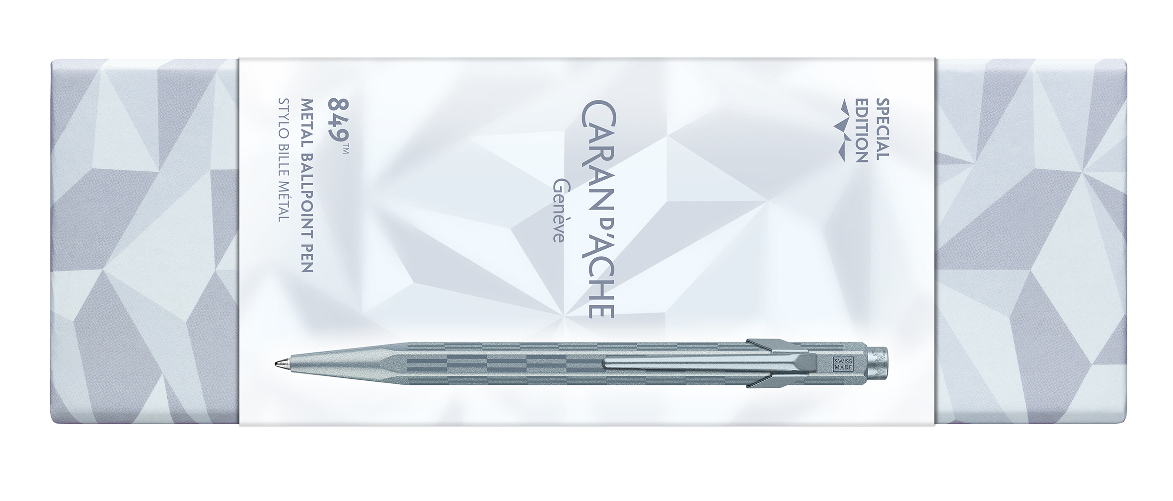 Die beiden Kugelschreiber und Druckbleistifte 849™ mit geometrischen Motiven, die an Eiskristalle mit frostigem Schimmer erinnern, werden zusammen mit einem passenden Notizbuch im A5-Format angeboten.