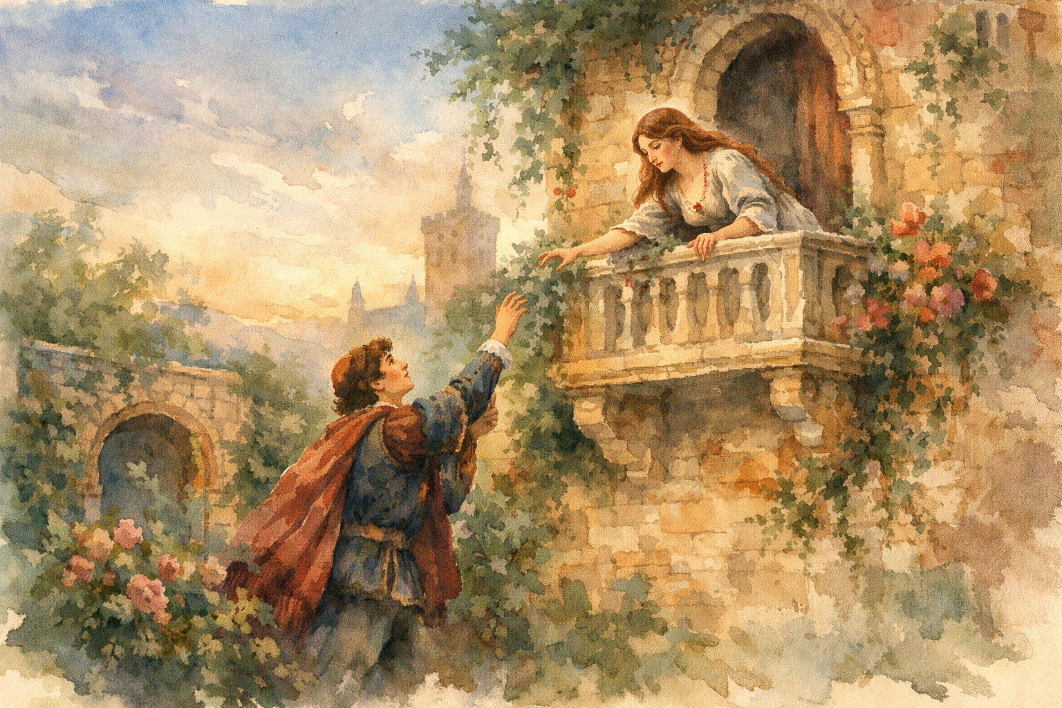 In Akt II, Szene 2 – der Balkonszene – kippt Romeo und Julia vom heimlichen Schwärmen in das große, riskante Sprechen. Romeo steht im Dunkel des Gartens, Julia erscheint „oben“, und noch bevor sie ihn bemerkt, hört er ihre Stimme. Dann dieser Satz, der die Szene wie ein Lichtkegel fixiert: „She speaks. O, speak again, bright angel“ – und in der klassischen Schlegel-Übersetzung: „Horch! Sie spricht. O, sprich noch einmal, holder Engel!“